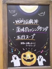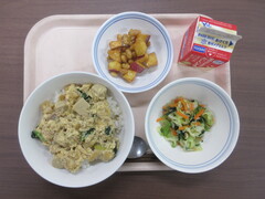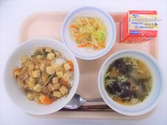 本日の給食は、四川豆腐丼、薬味ドレッシングサラダ、