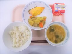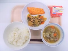 本日のメニューは、鮭わかめごはん、みそバター肉じゃが、