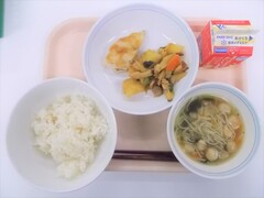 本日の給食は、江戸川区産小松菜および八王子市産さといも使用の献立です。