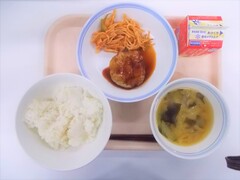 本日のメニューは、わかめごはん、厚揚げのそぼろ煮、