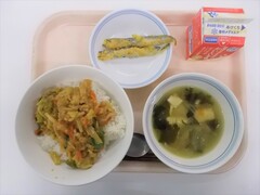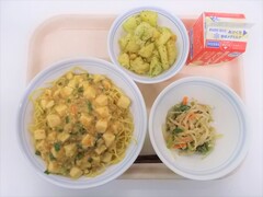 本日の給食は、エッグキーマカレー、海藻サラダ、