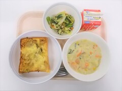 本日の給食は、ハムチーズトースト、豆乳チャウダー、