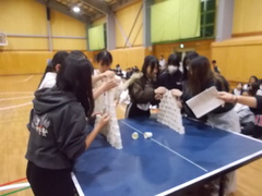 ピンポン玉バトンリレーの様子です。バトンにピンポン玉を乗せ、落とさないようにリレーをしています。
