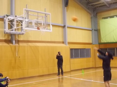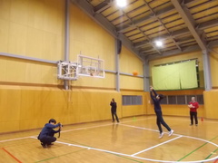 フリースロー大会です。各クラスの代表者がフリースローを行い、成功した数を競い合っています。