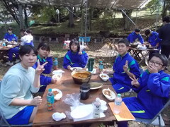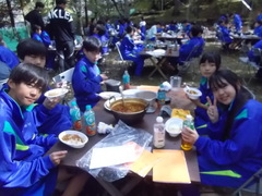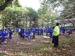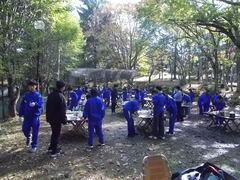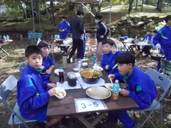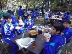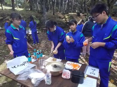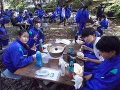 二日目午前の予定は飯盒炊爨です。肌寒いですが天気も晴れて、野外でカレー作りです。
