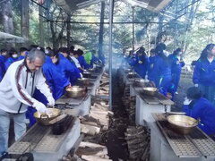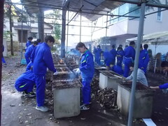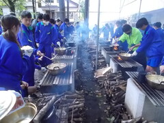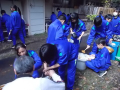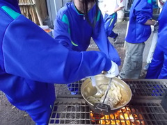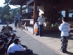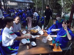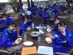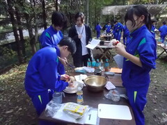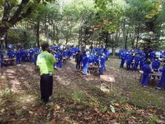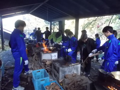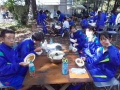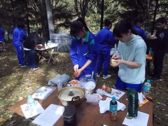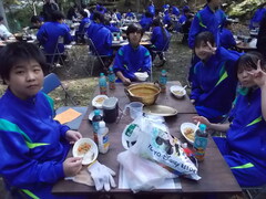 ホテルの方から、カレー作りと飯盒炊爨の説明を受けています。1年生の良いところは、人の話を聞くときに、注意をしなくても静かに聞く態勢になれる点です。