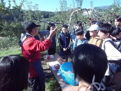 まずは、農場の社長さんからのご挨拶とリンゴ園の成り立ち、リンゴのもぎ方の説明です。