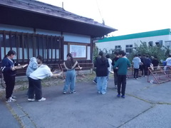 紙コップタワー高さ比べリレーです。紙コップを運び、紙コップタワーの高さを競い合っています。