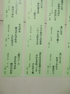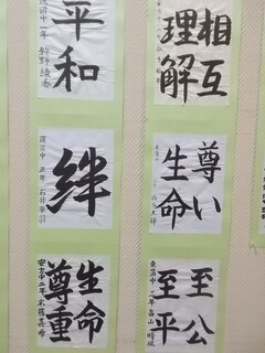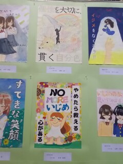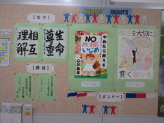 職員室前には、人権作品展に出品された絵画と標語と習字が