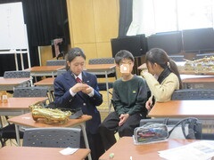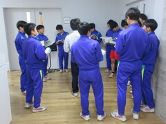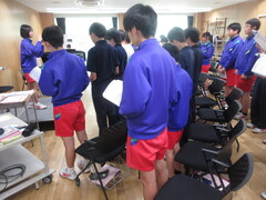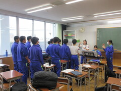 写真は吹奏楽部の様子です。中学生が丁寧に基礎から教えて