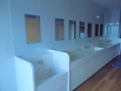 手洗い場の様子です。停電時の対応のためか、手動のハンドル式と自動の蛇口が交互についています。