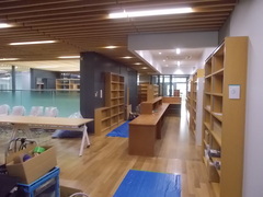 学校図書室(図書メディアセンター)の様子です。本棚やテーブルや椅子がおかれてきて、図書室らしくなってきました。