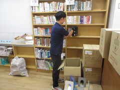 書棚に本を並べている様子です。9月1日からの新学期に向けて、準備をすすめています。