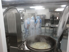 給食室では、給食開始に向けて調理の試行をしています。大きな窓