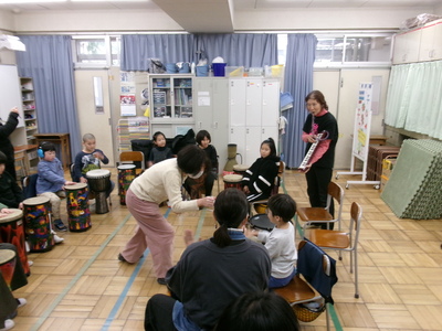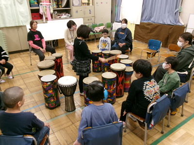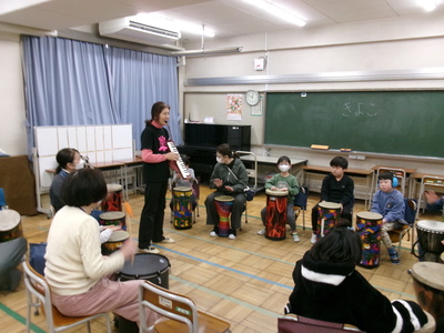 教室に入るとこどもたちは、ノリノリで体を揺らしながら太鼓をたたいていました。今日は、ドラムサークルの方々に来ていただき、授業をおこなっていたからです。