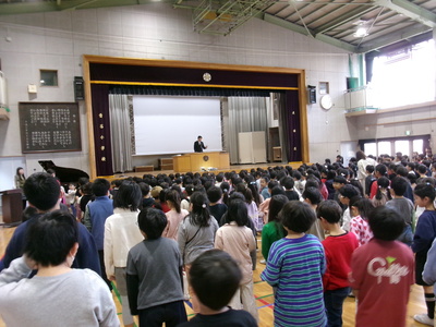 いつも月曜日の朝会は、放送で行いますが、今日は、体育館で行いました。