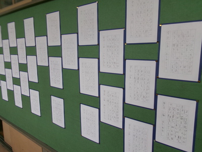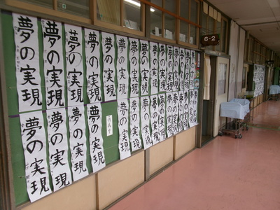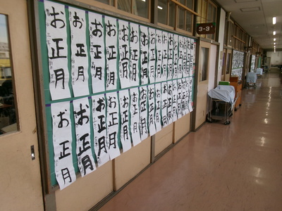 校内書き初め展の準備が進んでいます。各学級の廊下には、こどもたちが席書会で書いた作品が掲示され始めました。