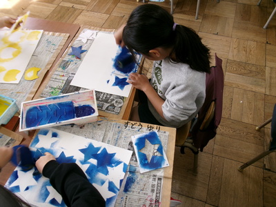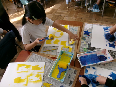 切った後の画用紙の形をローラーで塗ると、もちろんその形がうつり、切った形そのものの回りを塗ると、白くその形が浮き出てきます。手をインクで染めながらも皆、真剣に楽しんでいました。