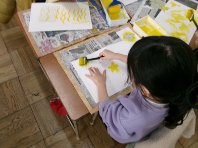 黒板には「たくさん うつそう わたしの形」と書いてあります。ローラーにインクをなじませて、自分の好きな形に切った形を画用紙にうつしていました。