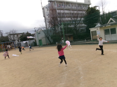 寒風が吹く中、1年生の学級が校庭で凧揚げをしていました。