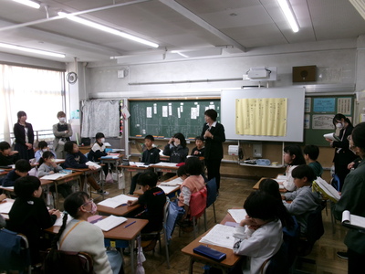 年間6回の研究授業の最後の回、6回目は、4年1組が行いました。研究主題は『互いのよさを認め合い、自分の言葉で表現できる児童を育む話し合いの学習~国語科における話す・聞くに着目して~』です。