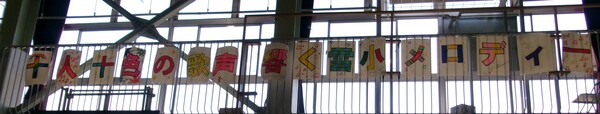 体育館には、今年のスローガン『十人十色の歌声響く 雪小メロディー』が掲示されています。