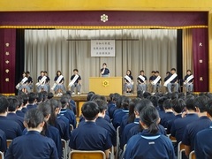 新入生、在校生ともに、立派な態度で式に参加し、代表生徒あいさつや、校歌斉唱では、中学生らしい堂々とした姿を見せてくれました。誘導や会場設営でてきぱきと行動し、式を支えてくれた2,3年生の係生徒の皆さん、ありがとうございました。